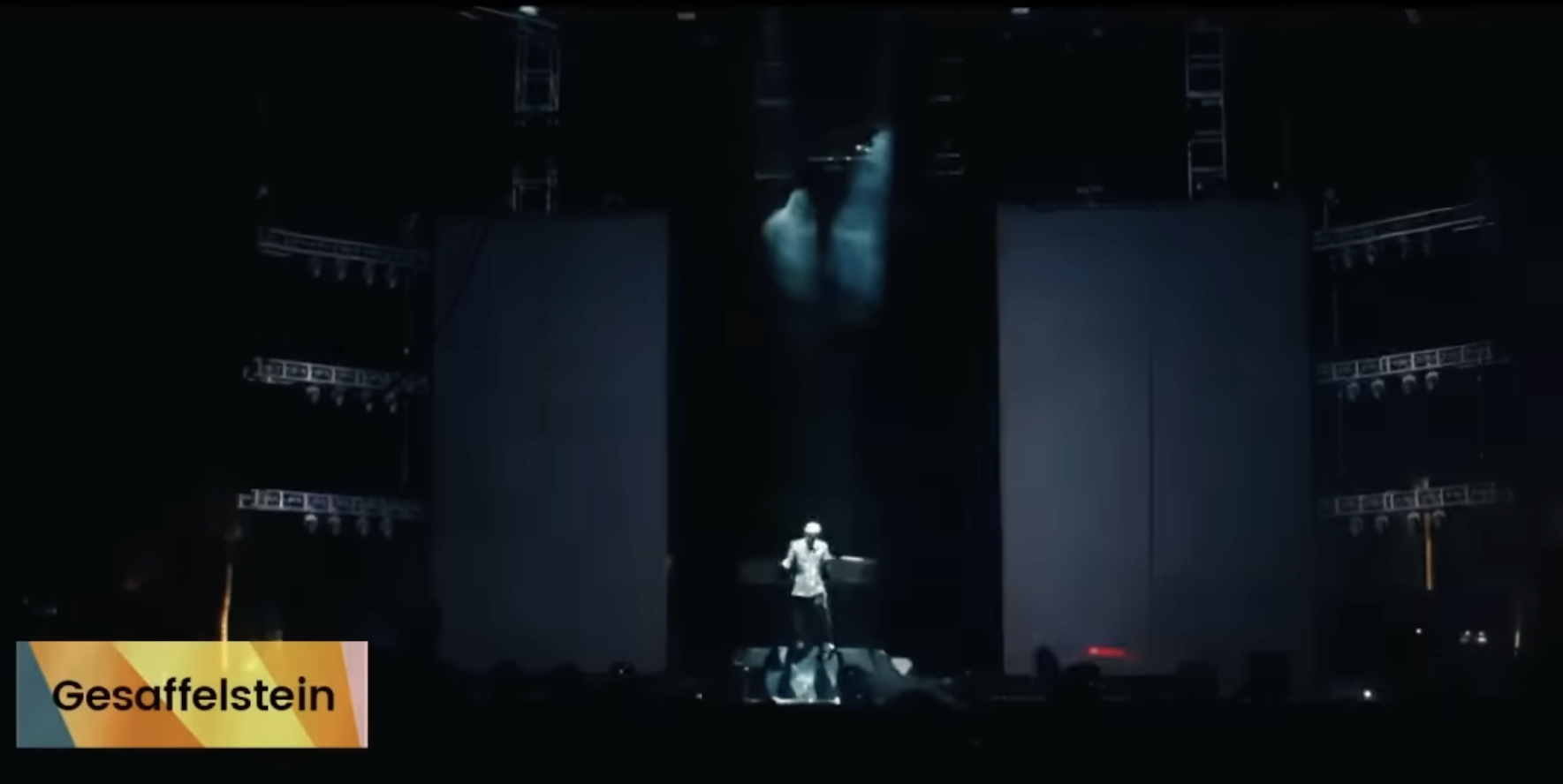 (↑ 2019년 코첼라)게사펠슈타인은 최초로 라이브 공연에 반타블랙을 사용한 아티스트로도 알려져 있습니다. 반타블랙은 나노기술을 이용한 색상소재로, 빛의 흡수율이 99.965%에 달해 한때 '가장 검은 물질'로 유명했던 물질이자 색상 그 자체입니다. 게사펠슈타인은 이 소재를 이용함으로써 무대 위 완전한 그림자처럼 보이는 효과를 얻는데, 이 때문에 그의 공연은 마치 하나의 커다란 그림자놀이처럼 보이기도 합니다.